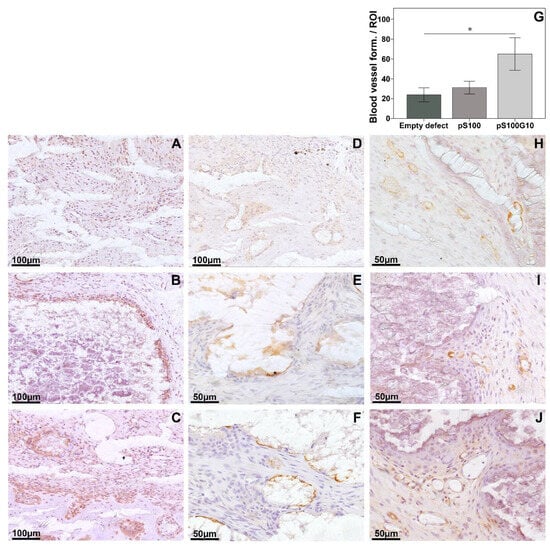 Immunohistochemistry of tissue sections, bone morphogenic protein-2;BMP2 (A–C), osteocalcin; OCN (D–F) and alpha smooth muscle actin; αSMA (H–J)-positive cells both in the entire defect region (left to right: empty, pS100, and pS100G10). An increase in BMP2 and OCN was seen in the pS100 and pS100G10 groups as compared to the empty defect. Immunohistological analysis of blood vessel formation showing the highest blood vessel formation in the pS100G10; * p = 0.031 (G).