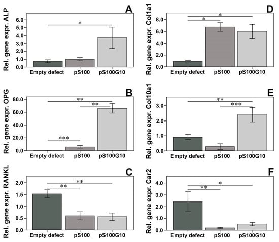 qPCR was used for gene expression analysis. The presented figure shows expression differences between the groups normalized to B2M gene expression (Figure 8). In the pS100G10 group, an enhanced expression of ALP as an osteoblast marker indicating the mineralization of bone was detected compared to the other two groups (p = 0.020). Osteoprotegerin, which prevents excessive bone resorption by binding to RANKL, was also significantly higher in the pS100G10 group compared to the pS100 (p = 0.006) and empty defect (p = 0.003) groups, respectively. A simultaneous reduction in the RANKL expression levels in pS100G10 and pS100 was also seen compared to the empty defect (p = 0.004) alone. The expression of Col1a1 was significantly increased in the pS100G10 (p = 0.003) and pS100 (p = 0.001) groups compared to the empty defect group. No difference in Col1a1 expression was seen between the test groups. In addition, Col10a1 in pS100G10 was significantly higher than that of the pS100 (p = 0.000) and empty defect group (p = 0.003). Moreover, carbonic anhydrase, an osteoclasts marker involved in bone matrix dissolution, was found to be significantly decreased in pS100G10 (p = 0.014) and pS100 (p = 0.001) compared to the empty defect group.