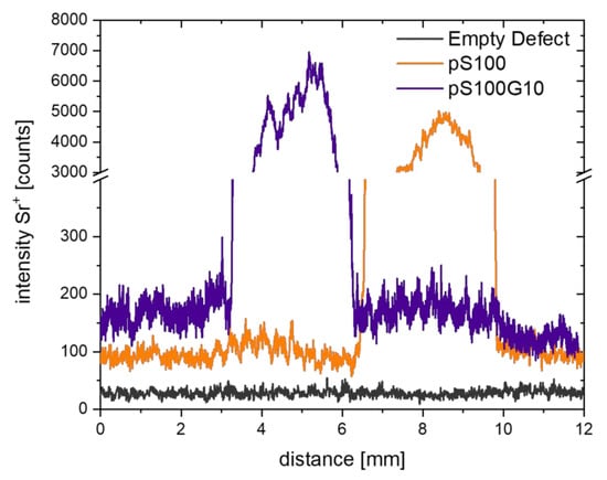 Furthermore, the release and transport of strontium was found in rat bone sections of both the pS100 (Figure 9h) and pS100G10 (Figure 9m) groups in the residual cement fragments, biomaterial–tissue interface regions, as well as in cortical and trabecular bone. Moreover, line scans of Sr+ mass images showed intensity gradients from both biomaterials to enclosing bone tissue, which is clear proof of the incorporation of strontium in mineralized bone tissue (Figure 10). The empty defect group served as the control and showed low intensity of natural strontium occurrence (Figure 9c, Figure 10).