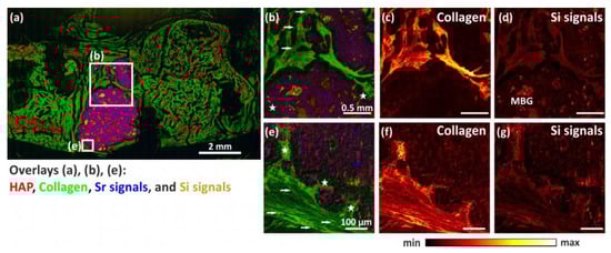 The overlay mass image (Figure 10a) of a pS100G10-containing rat femur cross-section shows the distribution of HAP in red, collagen in green, strontium signals in blue, and silicon signals in yellow (signals listed in Table 2). High-resolution ToF-SIMS mass images enable a detailed study of the former defect area around the fragmented bone cement (Figure 11b–g). Mass images of silicon signals (Figure 11d,g) show the silicon mass distribution in the initially created defect area in the same areas as those in which collagen occurs (Figure 11c,f). This is clear evidence that silicon is incorporated into newly formed collagenous soft bone tissue. Additionally, intact mesoporous bioactive glass particles (MBG) within bone cement could be detected (Figure 11d). Furthermore, pores were seen in the biomaterial, preliminarily at the cement–tissue interface. Due to contact with body fluids or bone marrow, the MBG obviously dissolved as expected (Figure 11b,e; indicated with a white star). Within these pores, newly formed bone tissue could be proven in the form of collagen mass signals (Figure 11b,c,e,f) This could also be validated by the histological findings and further supports the histomorphometric analysis. Furthermore, we were able to visualize the fibril structure of fresh collagenous tissue within the former defect area (indicated by arrows in Figure 11b,e), surrounding the bone cement.