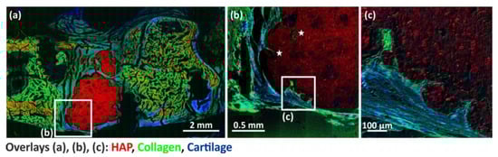 In addition, newly formed bone tissue in the form of sulfate signals, most likely originating from proteoglycans, according to [], could also be detected in areas of the former defect (Figure 12 An overview mass image of the pS100G10-containing bone section (Figure 12a) shows mineralized areas in red, collagen-related signals in green, and sulfate signals in blue. Sulfate signals occur in areas of newly formed bone (more visible in detailed images in Figure 12b,c), cartilage tissue, and growth joint. High-resolution mass images (delayed extraction mode; Figure 12b,c) of bone cement–bone tissue interface in the former defect area revealed that sulfate signals (blue) are found in areas of newly formed bone within the collagen matrix (green).