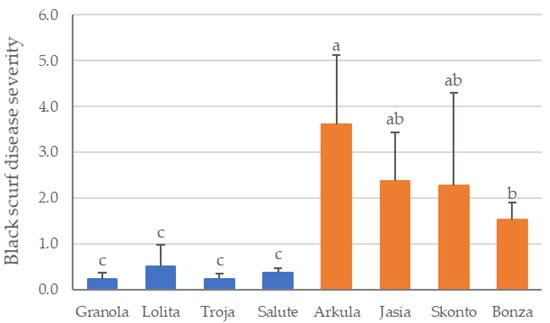 Disease severity of black scurf on potato cultivars in the field. Mean value and standard deviation (n = 4) are shown for disease severity group low (‘Granola’, ‘Lolita’, ‘Troja’ and ‘Salute’) in blue and for disease severity group high (‘Arkula’, ‘Jasia’, ‘Skonto’ and ‘Bonza’) in orange. DS was assessed as percentage infestation of tubers with sclerotia using scale from 1 to 5 with 1: without sclerotia, 2: <1%, 3: 1–5%, 4: 5–10% and 5: >10%. The average DS of black scurf from 120 randomly selected tubers was calculated (30 tubers per replicate). Different letters indicate significance among the cultivars (p < 0.05).