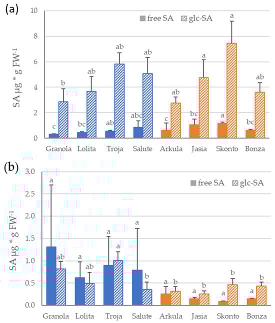 Salicylic acid (SA) content in shoots (a) and roots (b) of potato cultivars grown in sand culture. Free SA and glycosylated SA (glc-SA) levels were measured separately. Mean value and standard deviation (n = 4) are shown for disease severity group low (‘Granola’, ‘Lolita’, ‘Troja’ and ‘Salute’) in blue, and for disease severity group high (‘Arkula’, ‘Jasia’, ‘Skonto’ and ‘Bonza’) in orange. Different letters indicate significance among the cultivars within each metabolite analysis (p < 0.05); Student’s t-test shows significance of free SA content among the disease severity groups low and high (p < 0.05). SA, salicylic acid; glc-SA, glycosylated salicylic acid.