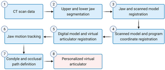The aim of this study is to develop a virtual articulator capable of reproducing personalized jaw movements and establish a digital workflow for creating a virtual articulation by utilizing jaw movement and information obtained from CT scans. The patient’s jaw movement is tracked before dental treatment, and this information is integrated into the articulation mechanism to construct a personalized mathematical model of jaw movement. The development of the virtual articulator involves the utilization of C++ and OpenGL libraries, with the application of VTK and ITK libraries for jaw extraction software. This model serves as a valuable tool for dentists and dental technicians in prosthesis design or treatment planning, particularly in cases where the patient is not physically present at the clinic. Furthermore, the mathematical model enables precise control over mandibular movement without the need for a mechanical or digital articulator. This eliminates the cumbersome process of employing a facebow for transferring digital cast models to the articulator space. The workflow for constructing the personalized virtual articulation is depicted in Figure 1.