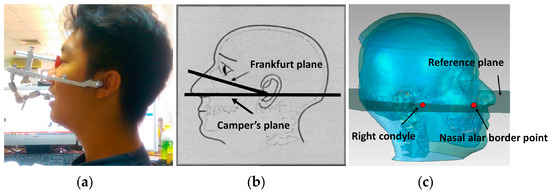 Setup of virtual facebow transfer: (a) Mechanical facebow; (b) Frankfurt and Camper’s planes; (c) the Camper’s plane using CT data.