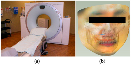 In order to obtain the CT images that include the complete jaw and TMJ information, we use SIEMENS Emotion 6 (Pittsburgh, PA, USA) (Figure 3a) to capture patient-specific CT data. By adjusting the threshold, the skin and the entire skull were extracted from the CT image. The surface mesh model was then generated using the Marching Cubes algorithm [31] and registered to a color facial 3D scan (RayFace by Ray Inc., Gyeonggi-do, Korea). This contoured face model makes the simulation more realistic. Through the iterative closest point (ICP) registration [32] of the upper and lower jaw models and the scanned teeth model, the segmented teeth of the CT data were replaced with high-precision scanned teeth. During the CT imaging, the patient was specially required to clench the upper and lower jaws to the maximum intercuspation (MIP). This ensured that the digital dental model was positioned according to this occlusal relationship as the initial position of the jaw movement tracking. The integrated result is shown in Figure 3b.
