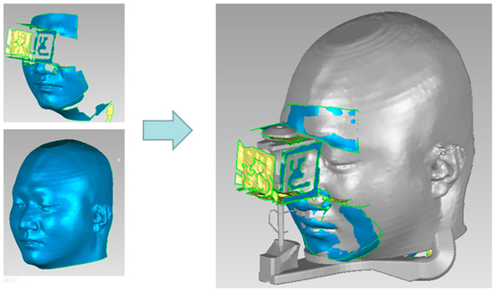 To register the tracking markers to the virtual articulator coordinate system, we used 3D scanning to scan the human face with the upper tracking marker. The human face was matched with the CT skin surface mesh using the ICP algorithm [32], thereby obtaining the relationship between the upper marker coordinate system and the virtual articulator coordinate system, as shown in Figure 5. The position of the lower marker in the virtual articulation coordinate system can be obtained indirectly from the relationship between the two markers and the camera. When the lower jaw moves, a point on the lower jaw moves to . Since the lower jaw and the lower marker are assumed to be a rigid body, can be deduced from Equation (16) in the virtual articulation coordinate system.