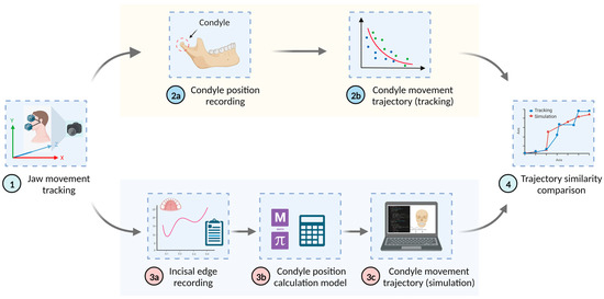 Flow chart of jaw movement verification and analysis. Step 1 involves tracking data to obtain information on the condyle position and incisal edge for tracking (step 2) and simulating (step 3), respectively. The obtained results of the condyle movement trajectory were compared in step 4.