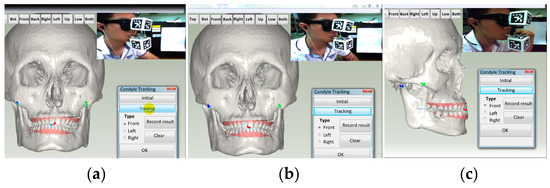 Following the affixation of two fiducial markers onto the upper and lower jaws, the patient was required to adjust the occlusal relationship to the centric occlusion (CO) position as the initial position of the tracking. Once confirming that the two markers are within the working range of the camera, the tracking can be started. The tracking results were subsequently combined with the cranial surface mesh model. Figure 8 visually depicts the real-time observation of jaw movement and the concurrent trajectory of the condyle. Additionally, the camera-captured image is displayed in the upper right corner of the screen.