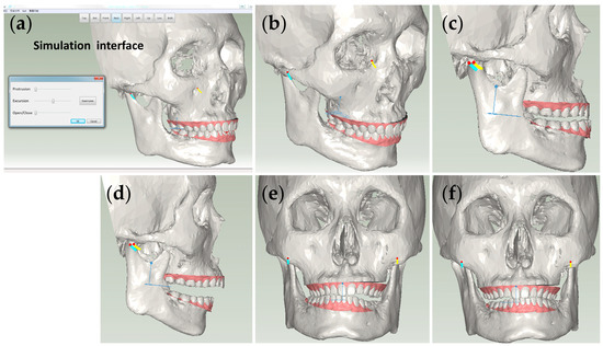 Simulation of virtual articulation: (a) User interface of virtual articulation; (b) CO position; (c) Protrusion; (d) Opening; (e) Right excursion; (f) Left excursion.