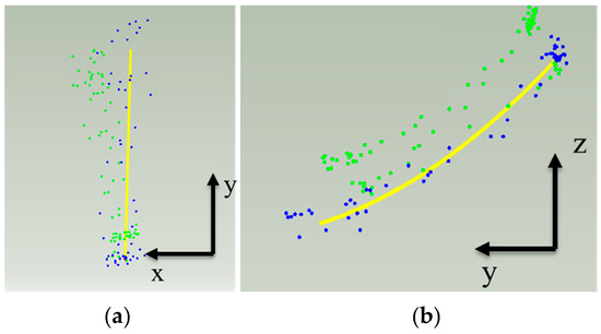 Figure 10. Projection of condylar path on (a) horizontal plane and (b) sagittal plane, in which blue points represent protrusion and green points represent lateral excursion. - The curve equations of these two two-dimensional planes can be combined into a three-dimensional curve in space, as shown in Equation (18).