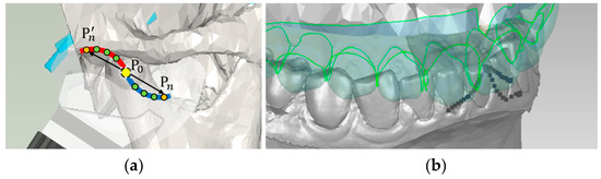 This personalized condylar curve equation replaces the fixed articulator mechanism of traditional mechanical articulators, so that a personalized mathematical model of jaw movement can be obtained. When tracking the mandible, the incisal edge movement trajectory of the patient’s protrusion and lateral excursions are also recorded, as shown in Figure 11b. These occlusal paths are used as the movement direction of the articulation, aligning the incisal movement to guide the occlusal path according to the patient’s habitual movement.