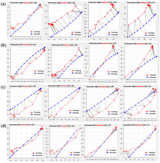 Experiments were conducted on the occlusal paths of anterior protrusion and lateral excursions. Each movement was conducted from the CO position to the extreme position, back and forth twice. After adding the mandibular motion information to the mathematical model of the articulator, we imported the positions of the incisal edge to calculate the positions of the condyles. The data were analyzed to compare the condylar trajectories between the direct tracking measurement and the inverse calculation from the incisal edge. The trajectory comparison results are presented in Figure 12, where the blue line represents the simulated trajectory, and the red line represents the tracking trajectory.