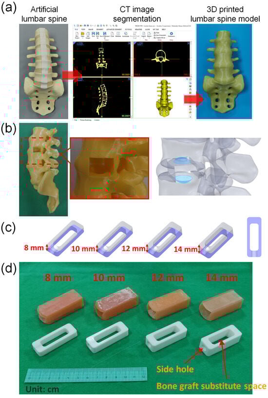 The main objective of this research is to validate two different techniques for implanting bone substitutes within cages of different heights using 3D printing. There have been many previous studies that used 3D-printed models to conduct research and evaluation on the spine [25,26]. This study utilized 3D-printed materials with consistent properties as substitutes for the lumbar spine. Additionally, the study aimed to simulate the clinical scenario of a surgeon inserting the cage, providing a realistic tactile experience. Therefore, 3D printing was employed to create the spine models for experimentation. Furthermore, by employing 3D printing, we can quickly and customarily optimize implant design. Furthermore, in addition to simulating and evaluating medical devices through 3D printing [27,28,29,30,31,32], future investigations may incorporate finite element analysis for mechanical simulations [33,34,35]. In addition, future research can use commonly used clinical materials (titanium or PEEK) to make cage models, and then conduct cadaver study, sawbones study, clinical study, or biomechanical evaluation of other implant designs. Through the validation of our 3D-printed models, this study provides valuable reference information on bone grafting and surgical techniques for medical device manufacturers and clinical practitioners. By enabling greater volumes of bone grafting, it may enhance the fusion success rates, thus benefiting patients [18].