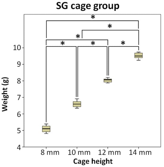 In the SG cage group, as each set of data represents an independent event, and the independent events exhibit a normal distribution with homogeneity of variance, an ANOVA test was performed. If the null hypothesis was rejected, an LSD post-hoc test was used to determine the mean value comparisons between each subgroup. Significant differences (p < 0.5) were observed between each subgroup using ANOVA and LSD post hoc tests.