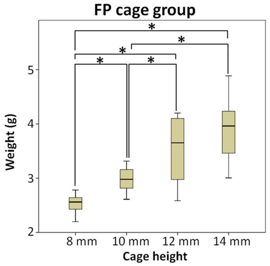 In the FP cage group, as the grouped data were all independent events exhibiting a normal distribution, but not homogeneity of variance, a Welch’s test was used to determine if the mean values across all groups were equal. If the null hypothesis was rejected, a Dunnett T3 post-hoc test was used for pairwise comparisons.