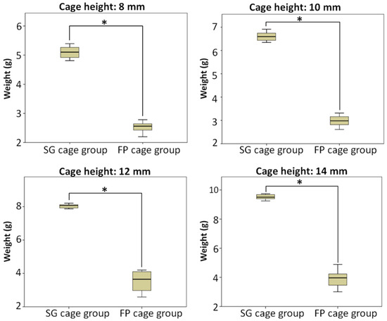 Figure 3 demonstrates that the amount of bone substitute filled in the SG cage group follows the order of cage heights: 8 mm (5.10 g), 10 mm (6.60 g), 12 mm (8.04 g), and 14 mm (9.52 g), respectively. As the cage height increases, the available space for filling the bone substitute also increases proportionally, resulting in a higher weight of bone substitute that can be accommodated. Using ANOVA and LSD post-hoc tests, significant differences (p < 0.5) were observed among each subgroup.