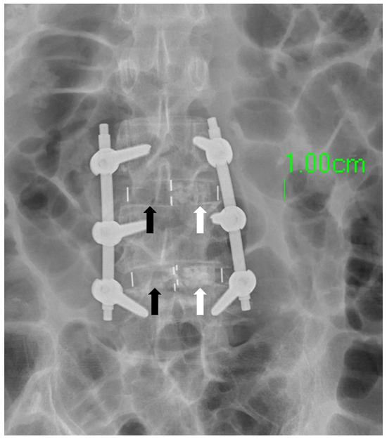 The white arrow designates the localization of the bone substitute, whereas the black arrow signifies its conspicuous absence within the designated region. This absence is attributed to the inadvertent scattering of the bone substitute into the retroperitoneal cavity during the cage-implantation procedure.