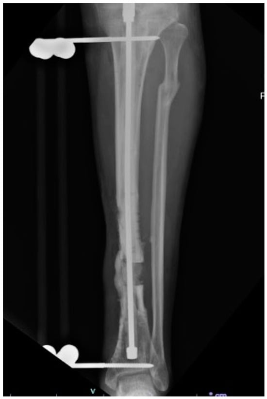 Radiograph of a tibial critical-sized bone defect associated with a fracture nonunion complicated by infection. The patient status is post-placement of an external fixator with an intramedullary antibiotic device pending distraction osteogenesis (Radiographs courtesy of Dr Joseph Patterson).
