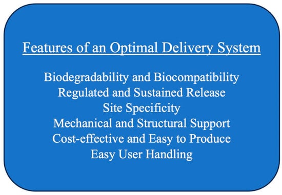 Cloned rhBMPs are used commercially as an alternative to allograft. The FDA has approved rhBMP-2 for the treatment of open tibial shaft fractures, anterior lumbar interbody fusion, alveolar ridge augmentation, and sinus lift, as shown in Table 2 []. Current FDA-approved rhBMP-2 is delivered on an absorbable collagen sponge (ACS) that can be applied directly to the targeted region []. Alternative growth factors have also been investigated in preclinical models using an ACS for delivery, as discussed in Section 2.1. Additionally, rhBMP-7 applied in a putty composed of bovine collagen and carboxymethylcellulose for long bone nonunion and posterolateral lumbar fusion had previously received a Humanitarian Device Exemption but has since been removed from the United States market by its supplier, as it was no longer considered “medically necessary” []. Despite these approvals, there is concern regarding the large doses of rhBMP-2 currently used for treatment to enhance its biological activity. Not only expensive, high doses of rhBMP-2 have led to a variety of complications, including heterotopic ossification, clinically significant dysphasia associated with soft tissue edema, and inflammatory reactions [,,,,,,]. Furthermore, it has been hypothesized that the rapid release of the BMP from the collagen sponge limits the body’s response [,,]. Although the collagen sponge remains the only FDA-approved carrier for rhBMP-2, there is much room for improvement in next-generation carriers (Figure 2). The most common new drug delivery modalities being developed are scaffolds, broadly defined as structures that can support cell growth; these scaffold designs include porous 3D matrices, hydrogels, spheres, and fiber meshes. There are four primary categories of biomaterials used for scaffolds, including natural polymers, inorganic materials, synthetic polymers, and composites [,]. Despite the abundance of carriers proposed in the literature, there are significant barriers to bringing new devices to market. Clinical application of next-generation scaffolds will require significant investment and large animal models demonstrating safety and efficacy greater than current treatment modalities. Although significant challenges remain, advancement in scaffold design and composition offers promise in reducing supraphysiologic dosing requirements for growth factors in clinical practice.