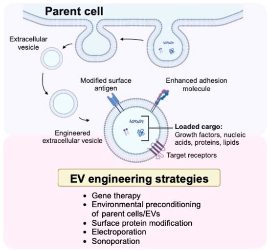 Schematic illustration of a parent cell undergoing ectocytosis of an extracellular vesicle and the engineering strategies to optimize extracellular vesicles (EVs) for bone repair (The figure was created with BioRender.com).