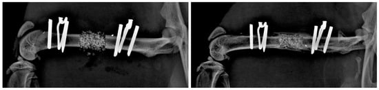 Radiograph of a 6 mm athymic rat critical-sized femoral defect treated with LV-BMP-2 transduced human adipose-derived stem cells loaded on a TCP-HA scaffold at postoperative day 0 (left) with the healed defect at 12 weeks postoperatively (right).