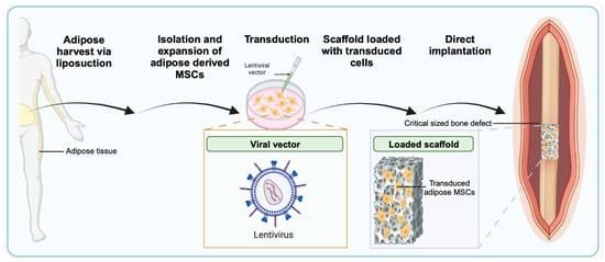 Human Adipose-Derived Stem Cells transduced with LV-BMP-2 loaded on a scaffold prior to implantation in a critical-sized bone defect. MSCs, mesenchymal stem cells; LV-BMP-2, lentivirus vector expressing bone morphogenetic protein. (The figure was created with BioRender.com).