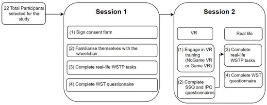 Participants completed two sessions in total. In the first session, participants were first introduced to the project aims, had the opportunity to ask questions, and were then asked to sign a consent form. Afterward, participants were given the opportunity to get acquainted with the real-life wheelchair, after which they completed a set of real-life driving tasks (see the following sections for details). At the end of the first session, participants filled out a WSTP-style questionnaire. After at least two days, but not more than a week, participants came back for their second session, in which they were randomly assigned either NoGame VR or Game VR training. During the VR training, the following parameters were collected: number of collisions, number of joystick movements (see Sum of Movement of the Joystick in Section 3.4.1), completion time for each task, and HR. The VR training was conducted up to three times (contingent upon the participants’ desire and experience of cybersickness), with a 5 to 10 min break in between. Where participants reported feeling unwell, the training was ceased immediately. After completing the VR training, the SSQ and the IPQ were administered. At the end of the second session, participants repeated the same set of real-life driving tasks as completed in their first session, followed by completing the WSTP Questionnaire. Figure 1 shows a flowchart of the setup of the study.