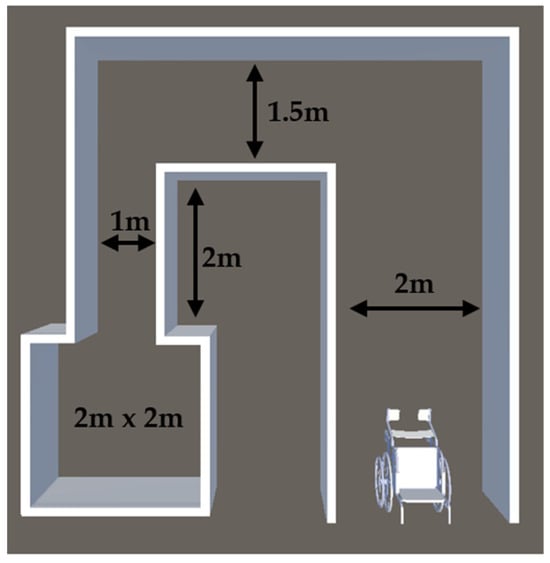 In this study, we developed two VR environments to conduct wheelchair skills training, using Autodesk Maya [] to produce all 3D elements and Unity 3D [] to develop the training system. One environment was designed to be non-gamified (see Section 3.2.2), and one environment was designed to be gamified (see Section 3.2.3). The participant’s performance before and after VR training was tested in real life (see Section 3.2.1). The following subsections discuss participant requirements and ethics (Section 3.1), the setup of the study (Section 3.2), the hardware used in the system (Section 3.3), and the data collected (Section 3.4).