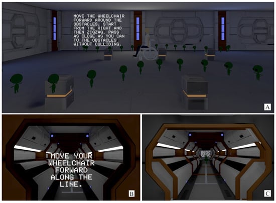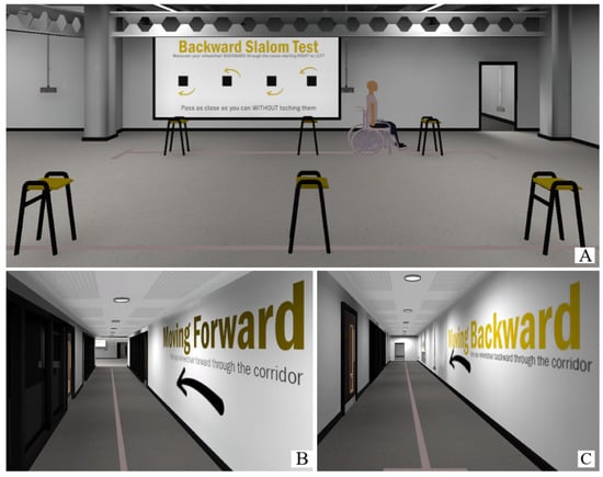 Game VR training. Image (A) represents the room where the forward slalom test and backward slalom test were performed. Image (B) represents the room where the forward test was performed. Image (C) represents the room where the backward test was performed.
