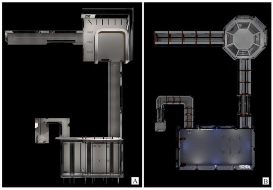 NoGame VR and Game VR training floorplans. Image (A) represents the floorplan view of the NoGame VR training, and image (B) represents the floorplan view of the Game VR training. The image is not to scale.