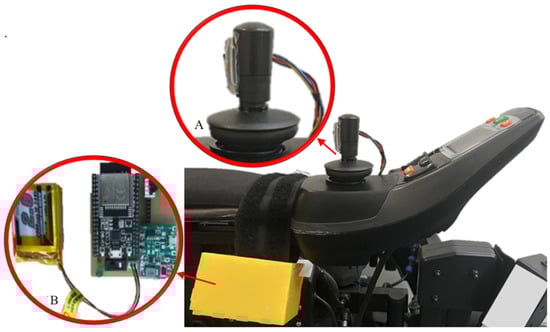 MPU-9250 sensor attached to the wheelchair’s joystick (Dx2-REM550/551) to control the VR System. Inset (A) shows the MPU-9250 sensor on the joystick. Inset (B) shows the ESP-32 microcontroller and the battery that powers it (housed in the yellow case), which is wired to the MPU-9250 sensor and wirelessly sends signals to the Microsoft PC.