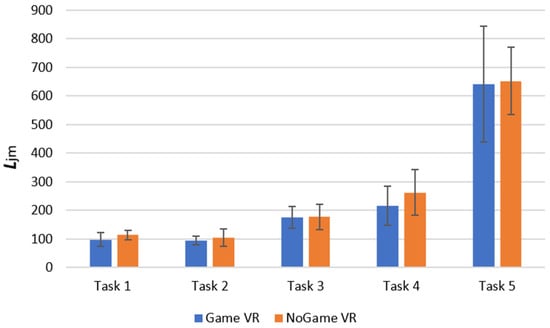 The IMU sensor was placed on the joystick in the vertical direction (see Figure 7 extension A). The accelerometer values in the x and y directions (horizontal plane) were recorded for each task, both during the real-life sessions and the VR training, and used to calculate a proxy for the total sum of the movements of the joystick, Ljm for each task. Following Farago et al. [], we applied the Pythagorean Theorem to the accelerometer data in the x and y plane to quantify a single movement of the joystick, and then we summed all those values to get a proxy of total movements. The joystick data for both the real-life sessions and VR training were collected using Unity3D. The real-life Ljm (from session 2 and for each task) from NoGame VR was compared with the one from Game VR through a Mann–Whitney U test; the same test was conducted for the Ljm from session 1 for those tasks that showed statistical significance, to check if the significant difference was truly the result of VR training.