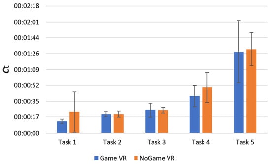 The completion time, Ct, for each task, was recorded both in VR and in real life using Unity3D. The real-life Ct (from session 2 and for each task) from NoGame VR was compared with the one from Game VR through a Mann–Whitney U test; the same test was conducted for the Ct from session 1 for those tasks that showed statistical significance, to check if the significant difference was truly the result of VR training.