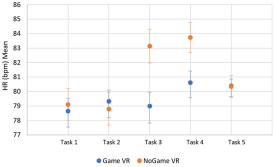 The HR measured throughout the whole VR training (and all tasks) for each participant was batched with the HR of the other participants from the same group; the two batches of HR data were compared using an independent t-test. As the test showed statistical significance, batches for each task from the two groups were compared with independent t-tests.