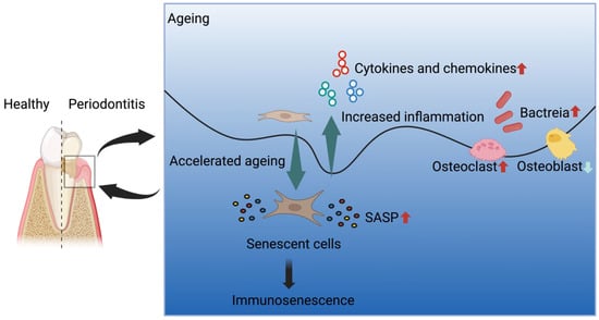Periodontitis is a ubiquitous chronic inflammatory disease characterized by the gradual destruction of the periodontal ligament and alveolar bone, leading to periodontal pocket formation and gingival recession []. Meanwhile, the presence of periodontal bacteria and viruses increases periodontal destruction []. This condition, if left untreated, can lead to the progressive destruction of tooth-supporting tissues, ultimately resulting in tooth loss and dental implant failure, as well as a subsequent decline in oral function and quality of life []. Consequently, the pursuit of therapeutic interventions aimed at treating periodontitis and effectively restoring compromised periodontal structures has been a major focus of research in oral medicine in recent years []. Ageing is characterized by the deterioration of biological processes in living organisms, resulting in the loss of function [,]. Additionally, studies have shown that ageing stands as a significant risk factor for a range of chronic diseases that can limit survival, independence, and prosperity. The older population is particularly vulnerable to various chronic conditions, such as cancers, atherosclerosis, diabetes, autoimmune diseases, and infectious diseases, including periodontitis []. Clinical research has demonstrated an increase in both the prevalence and severity of periodontal disease with advancing age, particularly after 30–40 years of age, and further exacerbation in most adults aged over 50 years [,,]. Moderate loss of the alveolar bone and periodontal attachment is common in older individuals []. Meanwhile, bacteria worsen the bone resorption around dental implants []. However, the exact contribution of ageing to the onset, progression, and remission of periodontitis remains poorly comprehended. An examination of the relationship between ageing and inflammation may pave the way for novel avenues of research in this domain and help identify potential clinical interventions that can reverse or mitigate the impact of ageing on periodontitis. By shedding light on this complex relationship, we may be able to develop effective strategies for improving the oral health and overall quality of life of the ageing population.