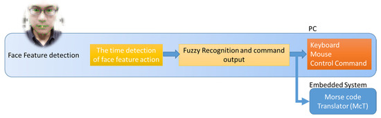 This study introduces a Morse code translation system (AIMcT) based on artificial intelligence enhanced images. The system uses artificial intelligence technology to extract facial features [30,31], encode facial movements, and then convert them into keyboard or mouse control commands through fuzzy time recognition algorithms to achieve computer interaction. The design approach to the AIMcT system is outlined below, and Figure 1 illustrates the architecture of an AIMcT system designed for severe disabilities.