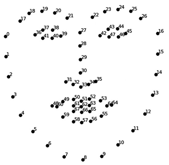 Dlib is a modern C++ toolkit that encompasses machine learning algorithms and tools designed for developing complex software in C++ to address real-world problems. In the AI Face feature extraction component, we utilized the Dlib image recognition module (version 19.8.1) [30], as depicted in Figure 2, to identify the mouth and eye regions as areas for autonomous movements. A facial movement recognition algorithm was created using 68 feature points, with P0–P16 representing the facial contours, P17–P26 denoting the eyebrows, P27–P35 corresponding to the nose, and P36–P47 and P42–P47 assigned to the right and left eyes, respectively. The mouth region is delineated by P48–P54, which represent the upper lip contours, P61–P63 for the inner contours of the upper lip, P55–P60 and P64 for the outer contours of the lower lip, and P65–P67 capturing the inner contours of the lower lip.