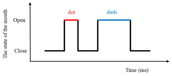 The artificial intelligence-enhanced Morse code translation system’s management of image command combinations hinges on the identification of mouth opening and closing states, as well as the duration of the intervals between them. The artificial intelligence Dlib module is used to detect the mouth opening and closing status. To enhance input efficiency and accuracy, and maintain the stability of these command combinations, the system dynamically adjusts the time threshold for opening/closing mouth movements. This study employed a fuzzy time recognition algorithm (FTR) for precise time threshold fine-tuning. Figure 3 illustrates the differentiation between long (dash) and short (dot) signals, determined by the duration between mouth opening and closing. The system combines the durations of closing and opening times to generate command combinations. For instance, if a long opening time repeats three times, the system produces the letter “o.” This system can generate characters as specified in the Morse code table [27].