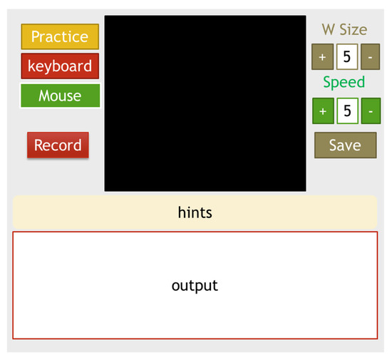 The human–computer interface layout of AIMcT is shown in Figure 5. The left side of the picture is the mode indicator. The “Record” button will record the operation time data of the practice mode for subsequent system performance analysis and improvement. The right side is the system function settings, including display and operation settings and the “Save” button which can save the settings. When the system is executed again, the previous settings will be automatically loaded. The “hints” field will prompt the user with operation information. For example, the practice mode will prompt the input sequence of long and short sounds of Morse code characters. The keyboard mode will prompt to turn on and off the input mode to prevent accidental input, mode switching codes, etc. The last “output” field can be used as the output display of characters in the practice mode, giving feedback to the user to correct the input method, so as to achieve the learning purpose of becoming familiar with Morse code input.