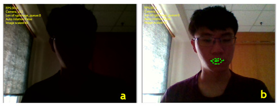 The image automatic compensation capability of the AIMcT system is illustrated in Figure 7. Figure 7a depicts a state with no lighting, where the Dlib module is unable to capture facial features. Following the system’s automatic light compensation calculation, as shown in Figure 7b, the image brightness is enhanced. This enables the Dlib module to function effectively, ensuring the AIMcT system’s proper operation, even during night-time.