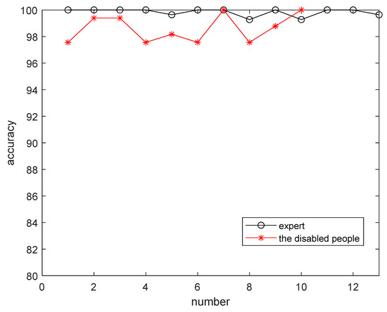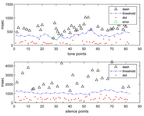 In this study, there are twenty-three human-typed data sets: thirteen data sets typed by wireless experts who are skilled in Morse code typing, and the other ten data sets typed by a person with a spinal cord injury. In Figure 8, the average recognition rates of expert data and disabled individuals are 99.83% and 98.6%, respectively. To observe the adjustment threshold of Morse code, we use the disability data set 2 to describe the recognition results, as shown in Figure 9. Figure 9 displays Morse code sequences typed by the disabled person. The symbol definitions are as follows: the ordinate represents the Morse code time length in milliseconds (ms); the abscissa represents the points of Morse code sequences; “Δ” indicates the long element (dash or long-silence); “·” represents the short element (dot or short-silence); “-.” refers to the predictive threshold; the green circle indicates the points of error recognition.