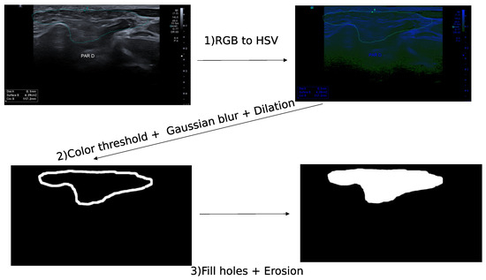 Annotation of contour on the RGB imgaes from GSID database. The first image represents the ultrasound image encoded in RGB values, the second image is the RGB image transformed in HSV, and the third image is the contour obtained with a dilation a Gaussian blur and a color threshold. The image on the bottom left is the annotated segmentation after filling the contour and an erosion.