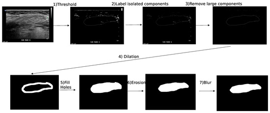 A threshold is a simple operation that selects grey-level values between 200 and 255, while the Gaussian blur applies a Gaussian filter of size (3, 3). The dilation and erosion operations are morphological operations based on a structural element given by a binary matrix. The dilated (respectively, eroded) value at a given pixel x is the maximum (respectively, the minimum) value in a window, defined by the structuring element, centered on x [49]. The images are finally resized to a size of (192, 192) via bilinear interpolation.