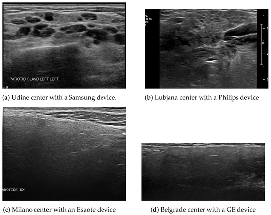 The open-source database of the Harmonicss project (HARMONIzation and integrative analysis of regional, national, and international cohorts on primary Sjögren’s syndrome (pSS) toward improved stratification, treatment and health policy making) contains 225 ultrasound images of 225 patients from 4 European centers [50], see Table 3. The salivary glands in the acquisition are parotid or submandibular collected by four different devices (Samsung, Philips, esaote, GE), see Figure 3. The database includes for each patient:
