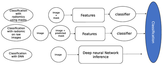 Three different classification schemes and the steps in each scheme: classification with radiomics features using masks, classification with radiomics features with DNN-predicted mask, and classification with a DNN.