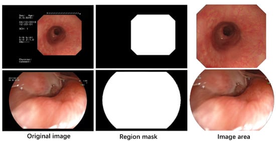 Significant differences exist between the sizes and types of endoscopic images captured by various models of digestive endoscopic instruments from various manufacturers. These images also contain nonendoscopic information such as instrument details and acquisition time. To mitigate the impact of these factors on the image quality assessment, this study employed dilation and erosion morphological processing methods to generate effective area masks. These masks were used to extract the relevant image regions, thereby enhancing the effectiveness of the endoscopic image quality assessment. The image preprocessing operation is illustrated in Figure 2.