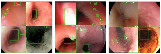 To address this issue, data augmentation techniques were employed in this study to alleviate the sample imbalance. Data augmentation involves the generation of variations in the original images, thereby increasing the training data volume without introducing additional images. Four types of geometric transformations are applied during the data augmentation process: mosaics [17], rescaling, inversion, and rotation. The results of the mosaic data enhancement are shown in Figure 4.