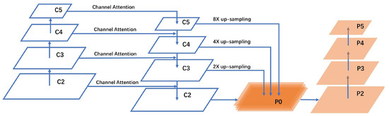 The feature enhancement method was employed in this study to fully use shallow feature information and increase the resolution of the feature maps for small targets. Deep features, which contain rich semantic information, were added elementwise to shallow features through bilinear interpolation. However, an accurate localization of shallow to deep features has become increasingly challenging. To address this issue, an additional pathway, called the pathway enhancement channel, was introduced. The number of convolution layers traversed by the information flow from deep to shallow layers is reduced by this pathway, enabling the propagation of shallow information to deep layers and enhancing the localization of deep positional information. The improved structure of the FPN is shown in Figure 7.