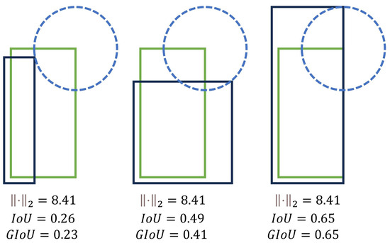 We introduced GIoU [22] as a new evaluation index loss function to replace the original evaluation index, IoU, in the cascade R-CNN. The GIoU formula ensures that the loss function for the target detection box regression is scale-invariant and maintains consistency between the optimization objective and the loss function. In the context of artifact identification in digestive endoscopy, there is a significant imbalance between positive and negative samples, which makes the training of the bounding box scores more challenging. Metrics based on L1 and L2 norms may yield significantly different IoU values for the two bounding boxes at the same distance. As shown in Figure 9, the example with the bounding boxes is represented by two corners. In all three cases, the distance between the representation of the two rectangles is the same for L2 norm; however, the IoU and GIoU values are very different. Furthermore, when IoU is the same, it only indicates that the Intersection over Union of the target box and the detection box is identical, but the actual size of the predicted box may be completely different. This highlights that neither IoU nor the L2 norm can adequately reflect the detection performance. Therefore, such loss functions are not ideal for predicting bounding boxes. Unlike IoU, which focuses only on the overlapping area, GIoU considers both overlapping and nonoverlapping regions, providing a better reflection of their intersection.